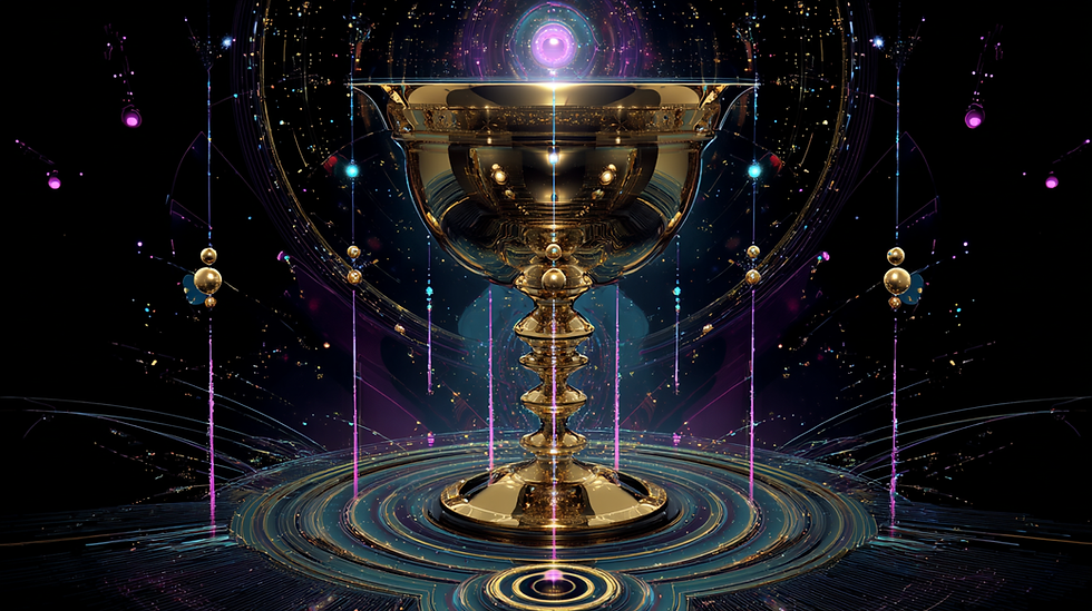 [Featured Image – Top of post] Massive golden chalice suspended in cosmic void, seven luminous orbs rising in a sacred spiral from its rim, rose-gold light pouring downward forming a living blueprint of choice points, magenta/cyan/purple shadows retreating, white divine geometry pulsing at the core. Pop Art Noir, ultra high contrast, glowing neon edges, ceremonial and transformative. --ar 16:9