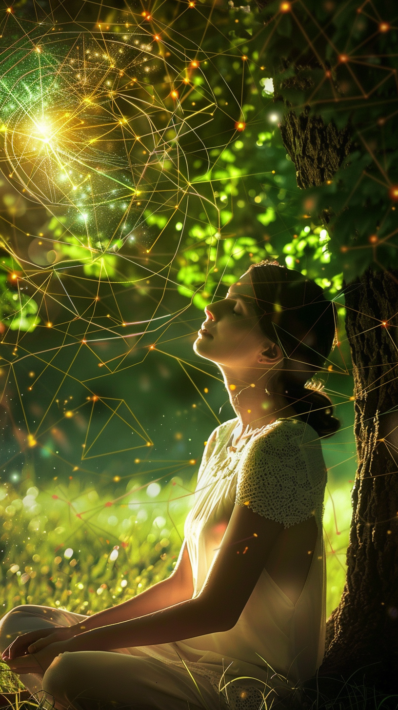 Energy becomes visible — light flowing heart to heart, leaf to wind.
